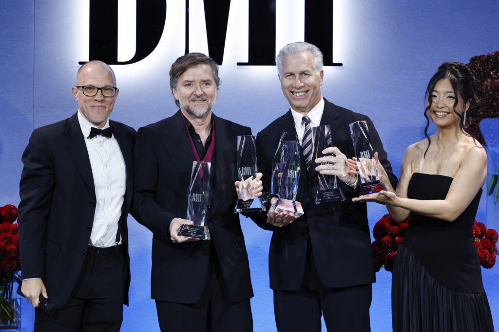 LONDON, ENGLAND – SEPTEMBER 29: Jon Miller, Director, Creative, Europe, BMI, Atli Örvarsson and Mike Steinberg Executive Vice President, Chief Revenue & Creative Officer, BMI and Anushka Gantumur, Executive, Creative, Europe, BMI onstage during the 2025 BMI London Awards at The Dorchester on September 29, 2025 in London, England. (Photo by John Phillips/Getty Images for BMI)