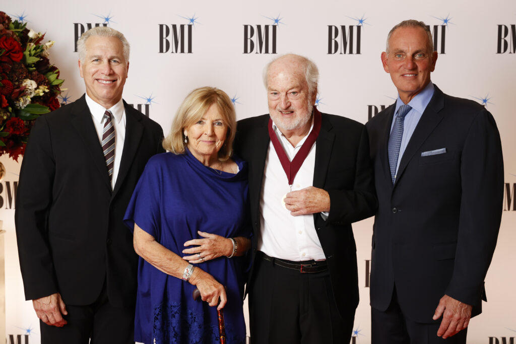 LONDON, ENGLAND – SEPTEMBER 29: (L-R) Mike Steinberg, Executive Vice President, Chief Revenue & Creative Officer, BMI, Pat Lyle, Graham Lyle and Mike O’Neill, President & CEO, BMI attend the 2054 BMI London Awards The Dorchester on September 29, 2025 in London, England. (Photo by John Phillips/Getty Images for BMI)