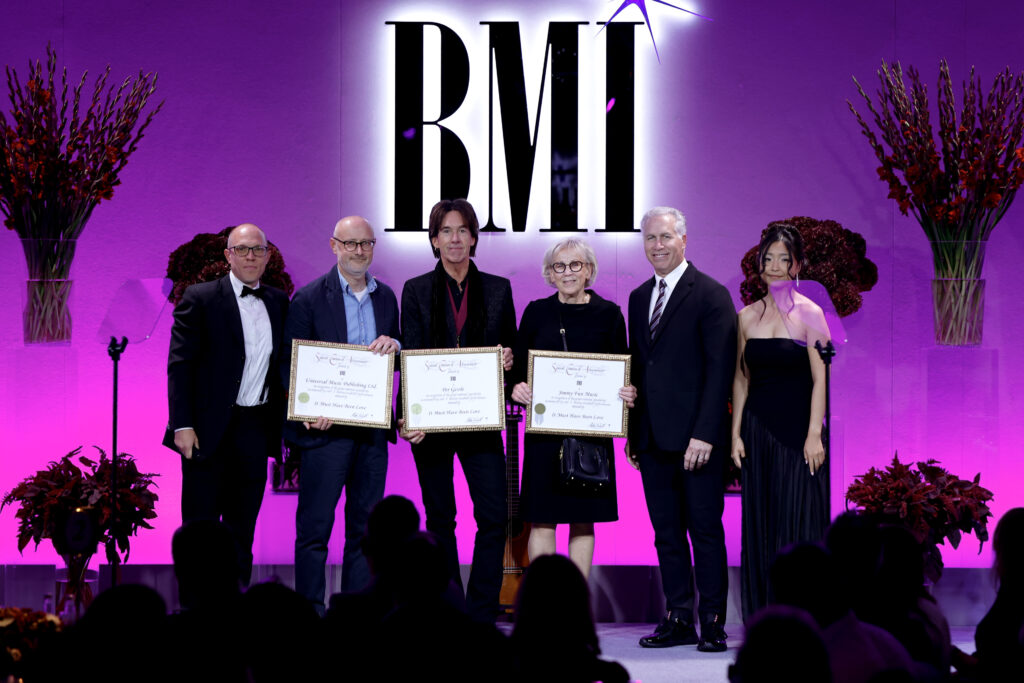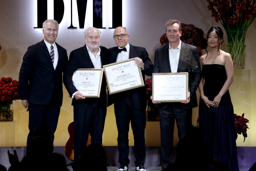LONDON, ENGLAND – SEPTEMBER 29: (L-R) Mike Steinberg Executive Vice President, Chief Revenue & Creative Officer, BMI, Graham Lyle, Jon Miller, Director, Creative, Europe, BMI, a guest and Anushka Gantumur, Executive, Creative, Europe, BMI onstage during the 2025 BMI London Awards at The Dorchester on September 29, 2025 in London, England. (Photo by John Phillips/Getty Images for BMI)